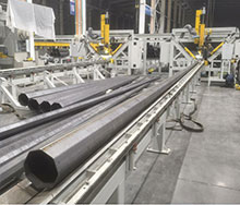 我公司自行開發的數控開卷斜剪生產線,直接從鋼卷到等腰梯形板輸出,自動化程度高,速度快。在非常成熟的數控雙機聯動折彎機的基礎上,我們做了很多改進,使得機器專門適合于快速高效生產路燈桿。應客戶的要求,我公司自行開發了數控電門切割機,自動底板焊接機,自動燈桿鉆孔機,數控電力桿大型自動直縫焊機等,并且不斷優化改進,適合燈桿行業的使用情況,大大改變手工作業的情況,提高桿子生產的品質和效率,降低制造成本。